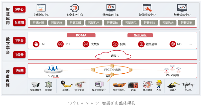 此次發(fā)布的華為智能礦山聯(lián)合解決方案,不僅引入了行業(yè)領(lǐng)先的5G、AI、鯤鵬云等新ICT技術(shù),還融合了煤炭行業(yè)內(nèi)智能礦山建設(shè)豐富專業(yè)的實(shí)踐經(jīng)驗(yàn),形成了“3個(gè)1 + N + 5”的智能礦山整體架構(gòu),即礦山一張網(wǎng)、礦山一朵云、礦山一平臺(tái)、以及N個(gè)應(yīng)用與5個(gè)中心。